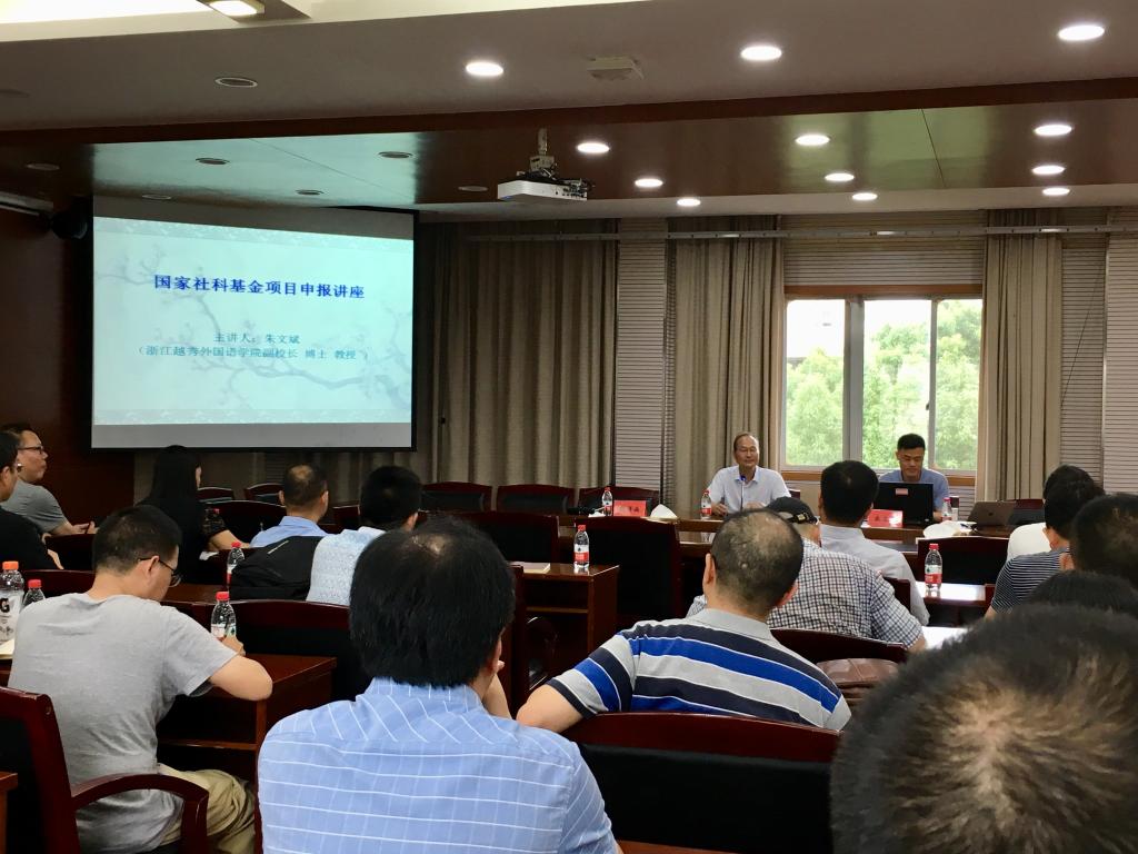 7月5日下午,浙江越秀外国语学院副校长朱文斌应邀来校作国家社科基金项目申报辅导报告。报告在临海校区第一会议室举行,科研处韩得满处长主持,副校长赵小明、王正出席报告会,各二级学科分管科研院长及人文社科教师共40余位参加。