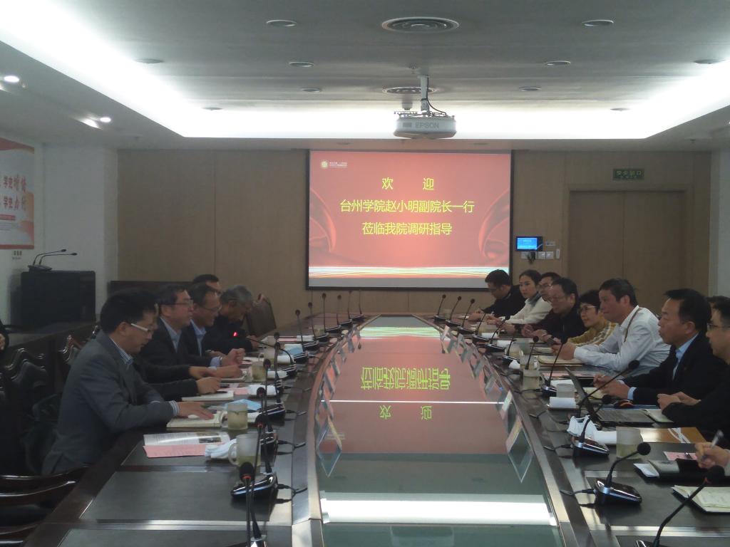 在温岭第一人民医院,调研组与医院领导班子就如何加强科研合作,实现院校共赢开展了深入的探讨。赵小明指出,本次调研是在台州学院成功升硕,温岭第一人民医院成功升三甲的背景下进行。作为台州学院的附属医院之一,温岭第一人民医院与学校开展深层次的科研合作不仅有利于助推台州学院的升格发展,也有利于医院提升相关指标,在三甲医院行列站稳脚跟。双方在项目申报、专利、成果转化等方面的合作进行了务实的探讨。
