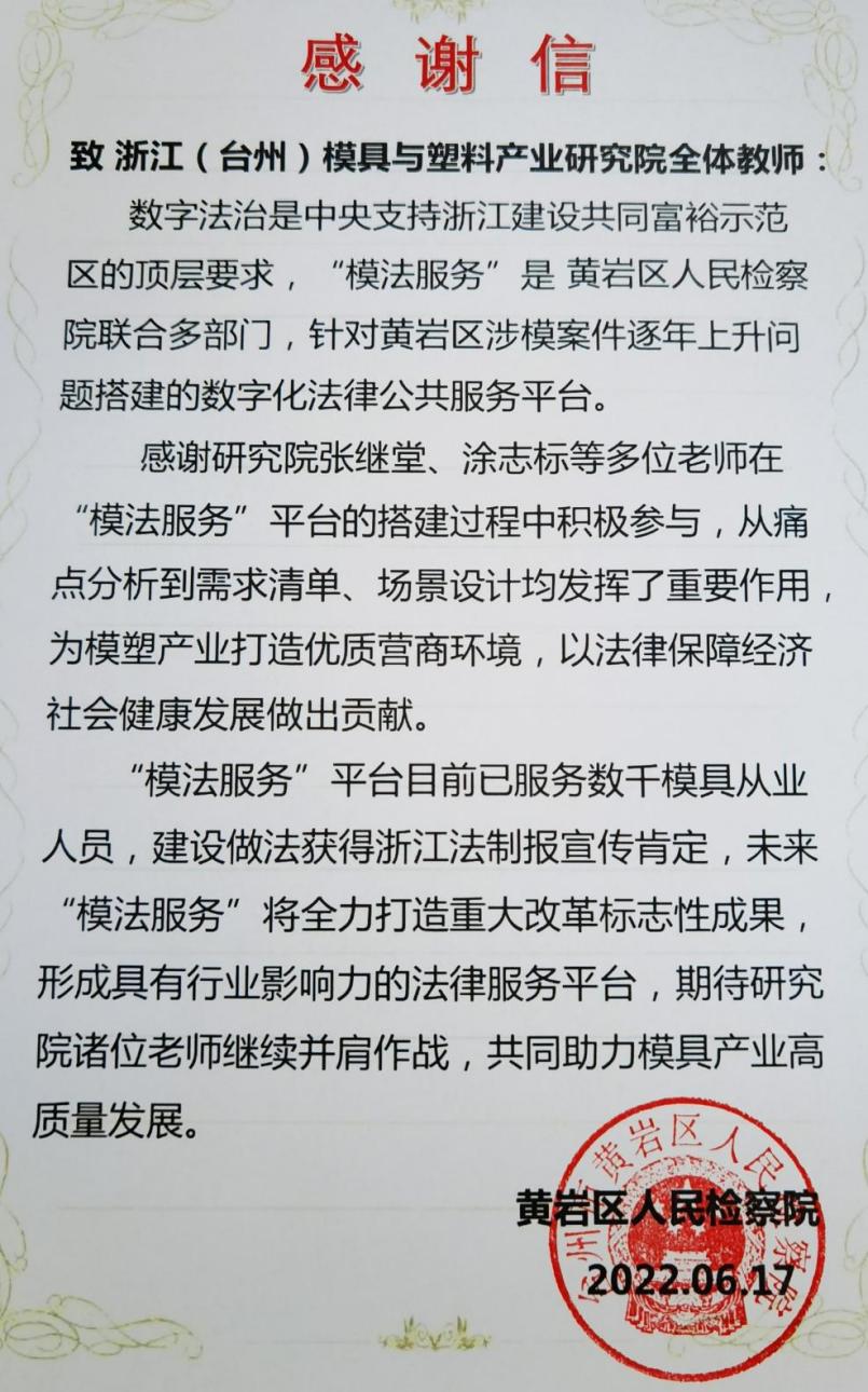 近日,我校浙江(台州)模具与塑料产业研究院收到来自黄岩区人民检察院的的感谢信。信中对我校模塑产业研究院的老师们在“模法服务”平台建设过程中的付出给予高度认可和肯定。