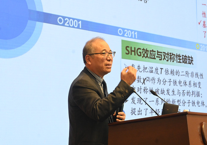 报告中,熊仁根院士首先回顾了自己在南京大学的求学经历,分享了他在分子铁电领域的耕耘历程。他秉着“勇于创新”、“踏实勤奋”以及“交叉融合”的精神,研究方向从非中心对称配合物逐渐深入到分子铁电体。熊院士还详细阐述了自己在铁电物理领域的研究契机,以及如何通过“似球-非球”、“引入单一手性”以及“氢/氟取代”这三种普适性策略,成功实现了分子铁电体的化学设计与性能优化。他提出的化学键重组铁电相变新机制,不仅深化了师生们对分子铁电体相变过程的理解,也为分子铁电材料的应用开辟了更广阔的空间。