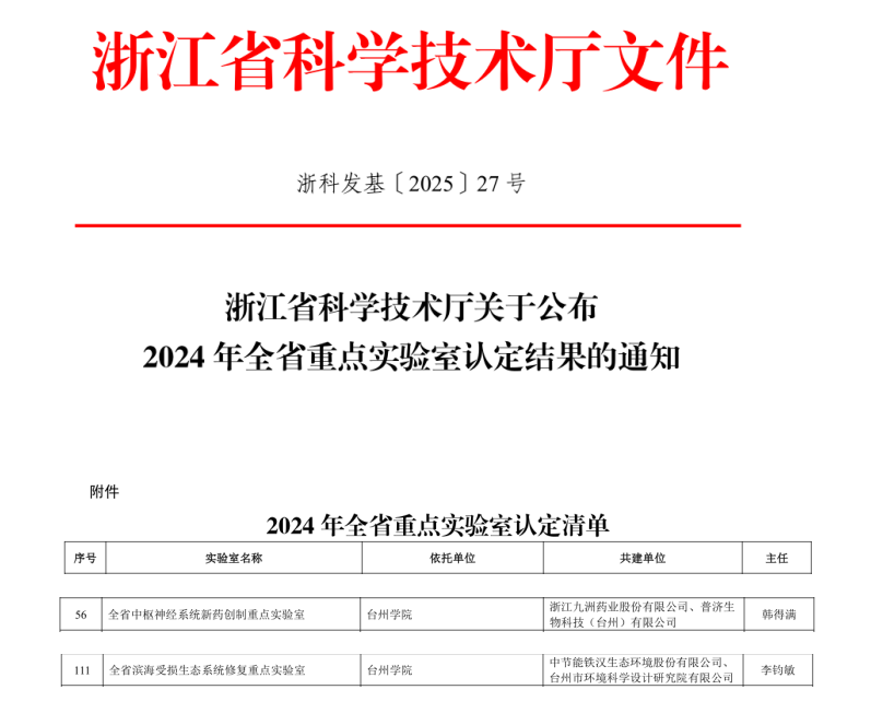 6月3日,浙江省科学技术厅发布《关于公布2024年全省重点实验室认定结果的通知》,我校牵头申报的“全省中枢神经系统新药创制重点实验室”和“全省滨海受损生态系统修复重点实验室”获认定。此外,参与共建的“全省特色抗感染药物生物制造重点实验室”也在此次公布名单中。