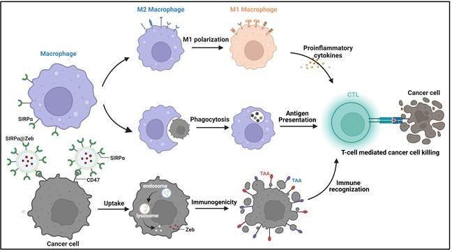 本研究设计制备了一种表达SIRPα受体的细胞膜纳米囊泡用于特异性地阻断CD47-SIRPα信号轴,促进巨噬细胞吞噬肿瘤,促进M2型巨噬细胞向M1极化,激活抗肿瘤免疫反应。另外,考虑到肿瘤通过低表达(或不表达)肿瘤相关抗原(tumor-associated antigen, TAA)逃避免疫监视,本研究利用SIRPα细胞膜囊泡内腔担载了一种DNA甲基化酶抑制剂泽布拉林(Zebularine, Zeb),通过Zeb增强黑色素瘤特异性抗原(CD146和TRP1)表达,促进免疫系统对肿瘤的识别;利用细胞膜囊泡上SIRPα受体与肿瘤细胞CD47配体结合,阻断肿瘤细胞与巨噬细胞间的“don’t eat me”信号,促进肿瘤抗原的加工递呈;通过极化的M1型巨噬细胞释放促炎因子,多途径激活机体抗肿瘤免疫应答,改善癌症治疗效果。本研究为基于吞噬检查点的ICIs药物研发提供了重要的数据支撑。