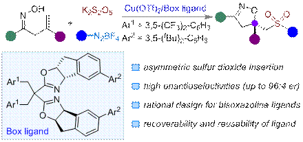 吴劼教授团队近年来一直致力于磺酰药物导向的二氧化硫参与的转化研究,并在二氧化硫参与的不对称自由基反应领域取得一些进展(Nat. Commun. 2022, 13, 7081.; Chem. Catal. 2022, 2, 164.; Chem. Sci. 2022, 13, 8834.)。基于前期的工作基础,该团队采用铜/双噁唑啉的不对称催化体系,实现了二氧化硫参与的烯烃不对称氧-磺酰化反应,构建了系列含异噁唑啉的β-手性砜。为了提高反应的对映选择性,作者使用肟为底物来增强底物中氧原子与铜催化剂的配位能力,并设计具有大侧臂和取代基的双噁唑啉配体来满足反应对电子性能和手性环境的需求。该体系磺酰基自由基来源方便,高效,并且可以弥补之前磺酰氯体系部分底物不适用的缺陷。