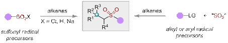 目前,磺酰基自由基的产生方式有两种:(1)依靠传统亚磺酰类底物的单电子转移过程;(2)通过自由基类型的二氧化硫插入过程。后者可以通过直接改变自由基前体的种类,快速产生多样性的磺酰基自由基,并避免由亚磺酰类底物合成方法造成的底物局限性问题。